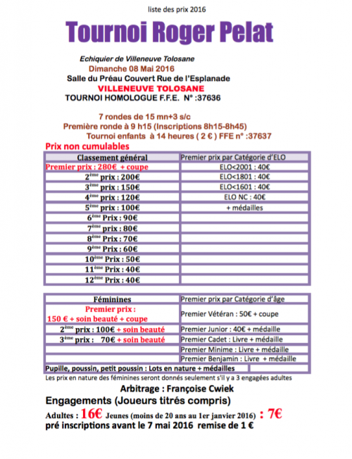 Accueil > Compétitions > Toutes catégories > Rapides > Tournoi Roger Pelat 8 Mai Villeneuve Tolosane